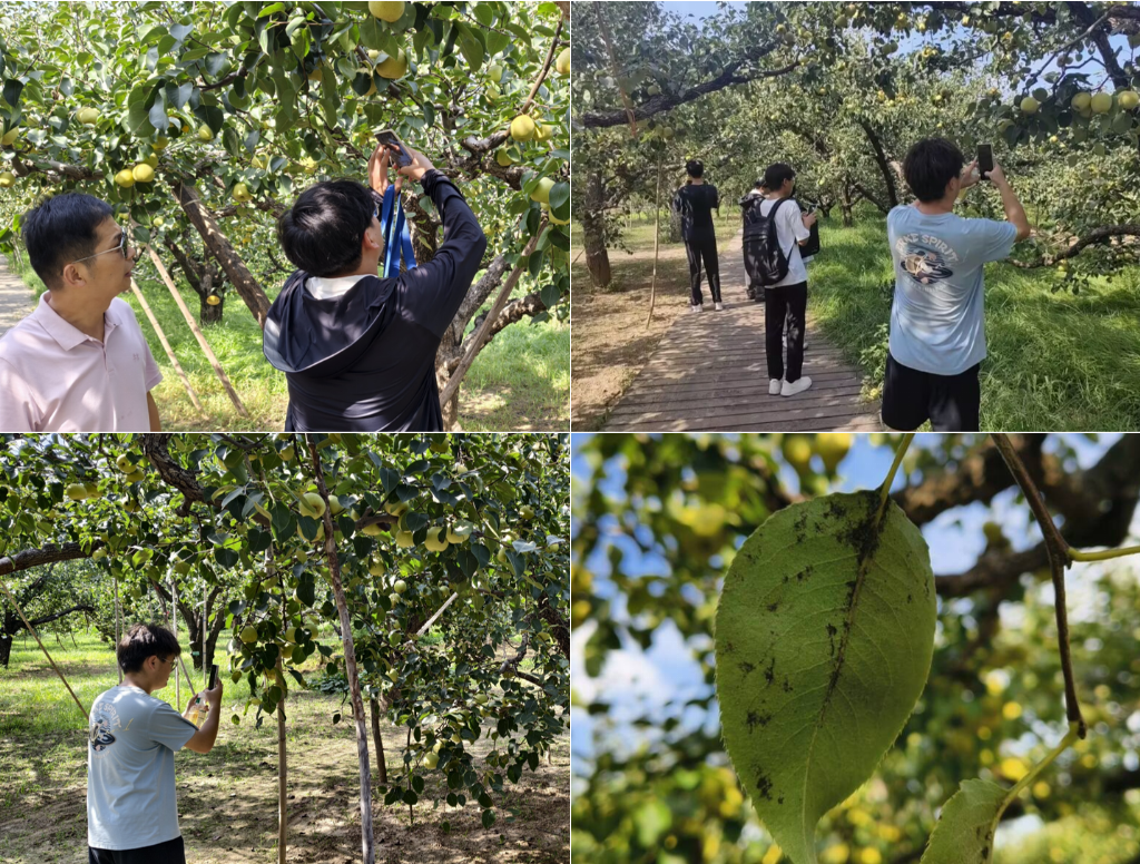 实践队深入梨园,开展田间实地勘察与样本采集工作。队员们手持专业设备,对梨树叶片、果实、枝干等部位进行细致观察与图像记录,发现了不同程度的病虫害症状,包括梨小食心虫蛀果痕迹、黑星病斑、蚜虫危害等。