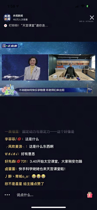自快手走红后,被人民日报、央视新闻等众多媒体接连报道的“快手科学姥姥”也参加了此次直播连线,为全国观众带来了一堂别开生面的“太空物理课”。